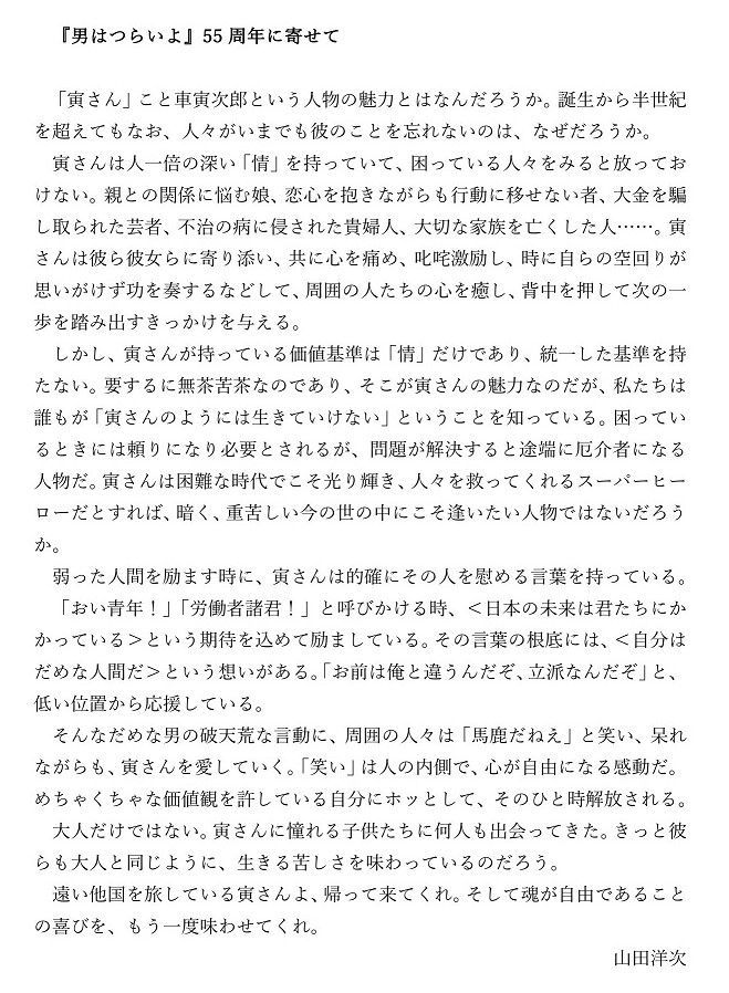 ⑤山田洋次監督から『男はつらいよ』55周年に際してメッセージコメントが到着!