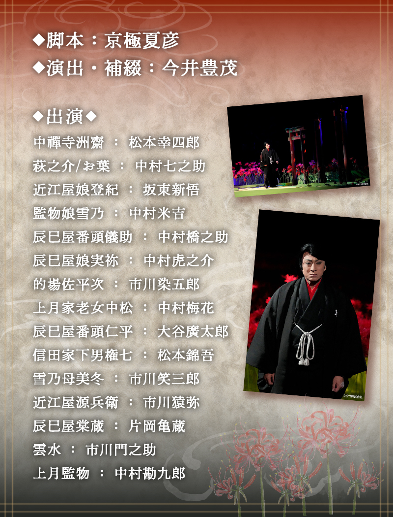 一面の彼岸花が暗闇に浮かび上がる怪しくも美しい舞台装飾に京極夏彦の世界観を反映した衣裳、とまさに“京極夏彦ワールド”が幻想的に表現された空間で、美しい青年・萩之介(中村七之助)の幽霊騒動をめぐり次々と起きる悲しい事件の真相に、中禪寺洲齋(松本幸四郎)が挑みます。