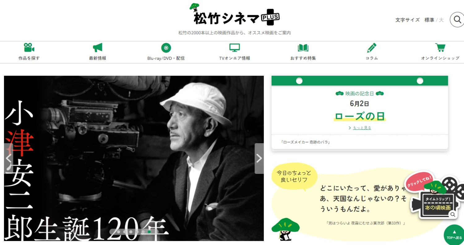TOPページには、Blu-ray/DVD、デジタル配信の新作や、松竹が取り組む周年イベントなどを、お知らせします。