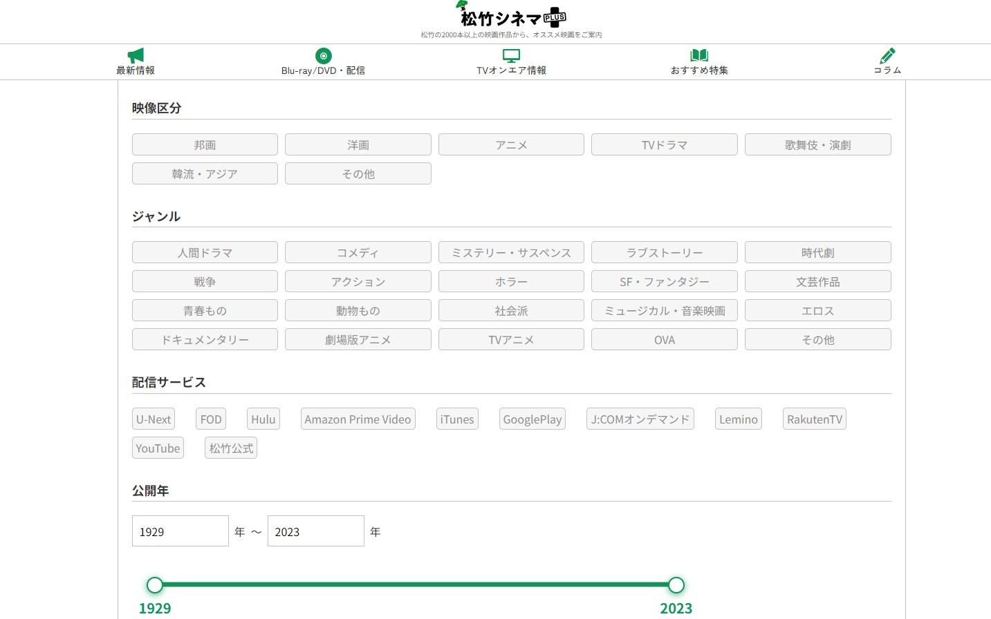ジャンルや気分、シリーズや松竹を代表する監督からの検索はもちろん、配信サービスや公開年を範囲指定して作品を探すことができます。